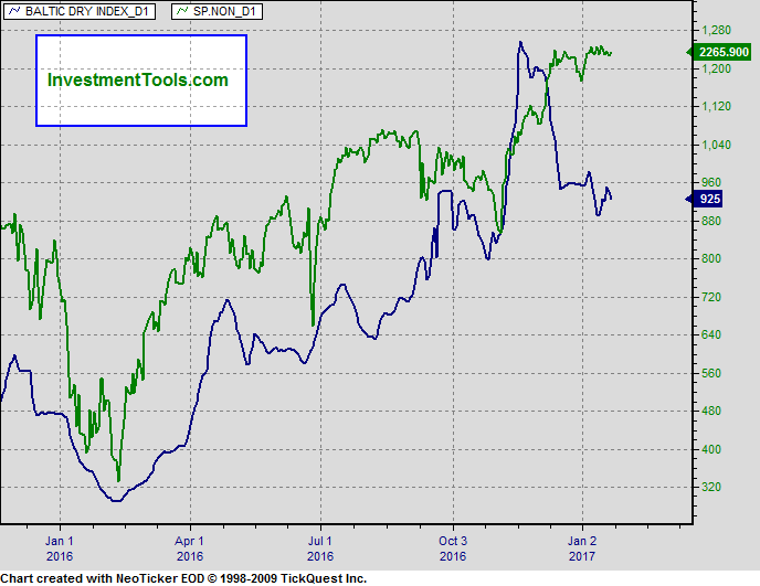 There is significant uncertainty ahead. The Fed has indicated that it will raise interest rates as often as three times in 2017. Markets don’t respond well to 3 successive rate hikes. Globally, economic growth is still anemic, and there is speculation as to international trade protocols with the new administration. Following is a chart of the Baltic Dry Index (blue) - which is a leading indicator of global economic activity - and the S&P 500 (green).